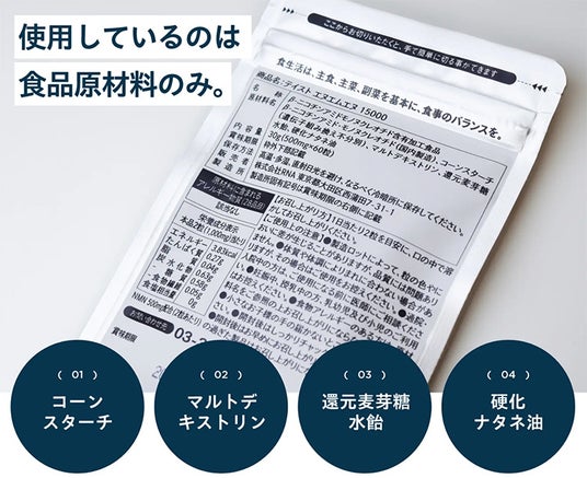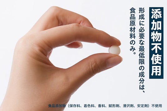 形成に必要な最低限の成分は食品原材料のみ。食品添加物(保存料、着色料、香料、賦形剤、滑沢剤、安定剤)不使用で、NMNをダイレクトに味わう新たなサプリメントです。