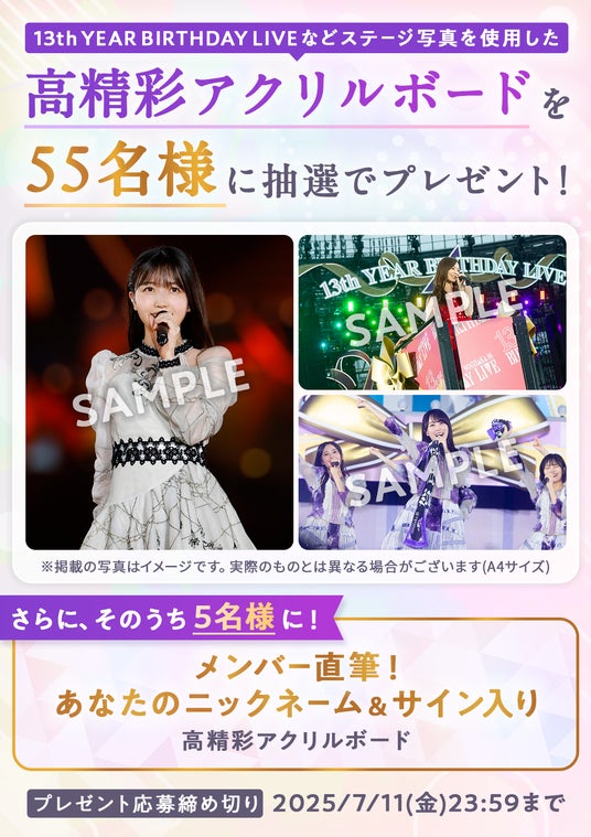 「のぎ動画」会員の皆さま全員に参加いただける「のぎ動画」にまつわる検定を開催いたします。全46問のクイズに挑戦し、全問正解した方の中から抽選で55名様に、『13th YEAR BIRTHDAY LIVE』などのライブステージ写真を用いたオリジナル高精彩アクリルボードをプレゼントいたします。「のぎ動画」の知識を試しながら、ぜひ奮ってご参加ください。