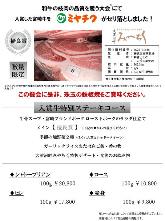 【選りすぐりの宮崎牛を堪能できる!】6/23(月)スタート!ミヤチクレストランにて、無くなり次第終了の入賞牛フェア開催!