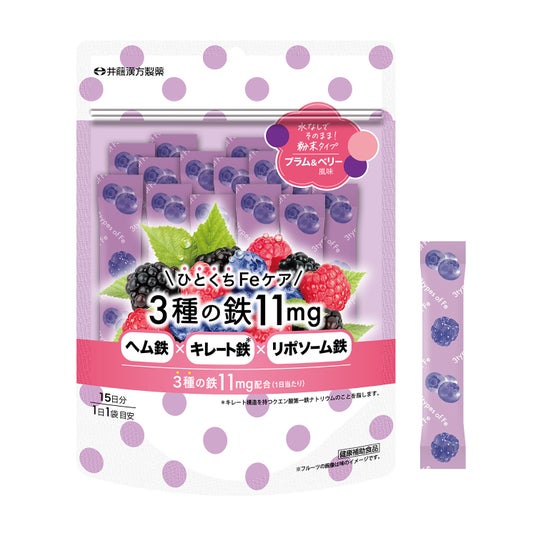 プラム&ベリー風味の粉末スティックタイプで、水なしでそのまま手軽に摂取できます。持ち運びにも便利な個包装なので、忙しい日々の合間や外出先でも、いつでもどこでも簡単に鉄分をチャージできます。