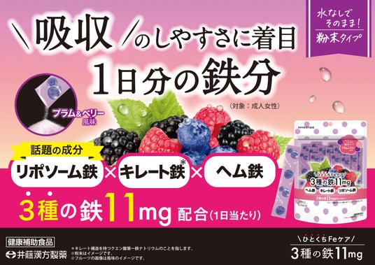 健康食品をはじめ医薬品、医薬部外品などを製造・販売する井藤漢方製薬株式会社(本社:大阪府東大阪市、代表取締役社長:井藤竜生)は、ひとくちケアシリーズ第二弾として吸収性の異なる3種の鉄を配合した【\ひとくちFeケア/ 3種の鉄11mg】を、2025年6月23日(月)より新発売いたします。