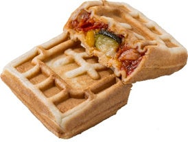 ハッシュルワッフル『アラビアータ』は、生地に完熟トマトの甘みとピリ辛の唐辛子が効いたアラビアータフィリングに、ナスやパプリカ、ズッキーニなどのグリル野菜を合わせ焼き上げました。