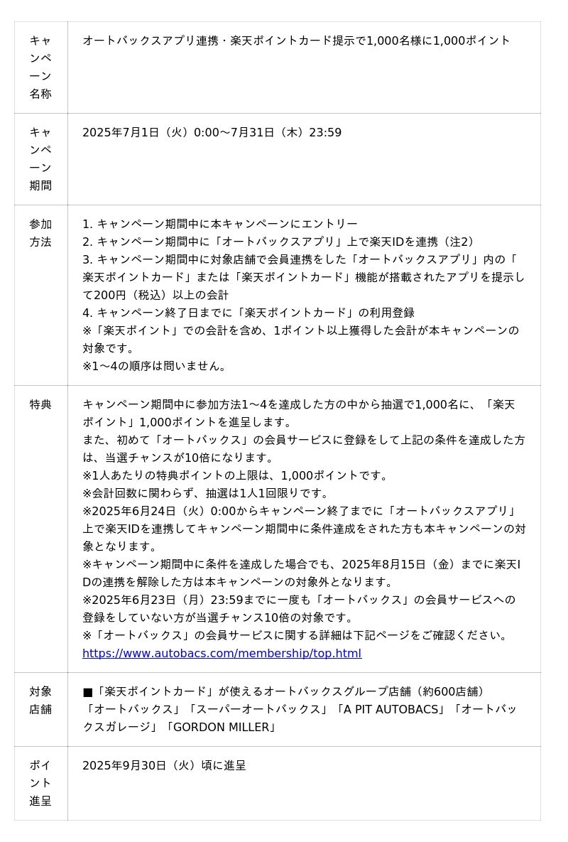 本サービスの開始を記念して、2025年7月1日(火)から7月31日(木)まで、「オートバックスアプリ連携・楽天ポイントカード提示で1,000名様に1,000ポイント」キャンペーンを実施します。キャンペーン期間中にエントリーのうえ、オートバックスグループの対象店舗(注4)で楽天IDを連携した「オートバックスアプリ」内の「楽天ポイントカード」のバーコード、または「楽天ポイントカード」機能が搭載されたアプリを提示し、200円(税込)以上の会計をした方の中から抽選で1,000名に「楽天ポイント」1,000ポイントを進呈します。また、初めて「オートバックス」の会員サービスに登録をして、条件を達成した方は、当選チャンスが10倍になります。