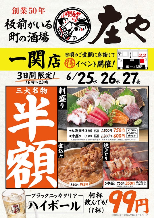 「はい!よろこんで」でお馴染みの“板前がいる町の酒場”『庄や』一関店(運営:株式会社大庄)は、2025年6月25日(水)より6月27日(金)までの3日間限定で、日頃のご愛顧に感謝を込め「刺身盛り合わせ」「煮込み」「焼き鳥」の三大名物を半額とする“半額感謝祭”を実施します。自慢の鮮魚を使った刺身盛り合わせ「大漁盛り(8種盛)」は、通常1人前1,500円を半額の750円、同「沖盛り(5種盛)」は通常1人前1,200円を600円にて。加えて、不動の人気「煮込み」は通常390円を半額の195円。さらに、創業から受け継がれる味わい「焼きとり五本盛り」は、通常700円のところ半額の350円での超特価で提供します。