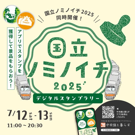 国立ノミノイチ会場とnonowa国立をめぐるデジタルスタンプラリーを開催します。全4つのスタンプを集めた方にプレゼントをお渡しします。事前にスマートフォンに「中央線と暮らす」アプリをダウンロードのうえ奮ってご参加ください。