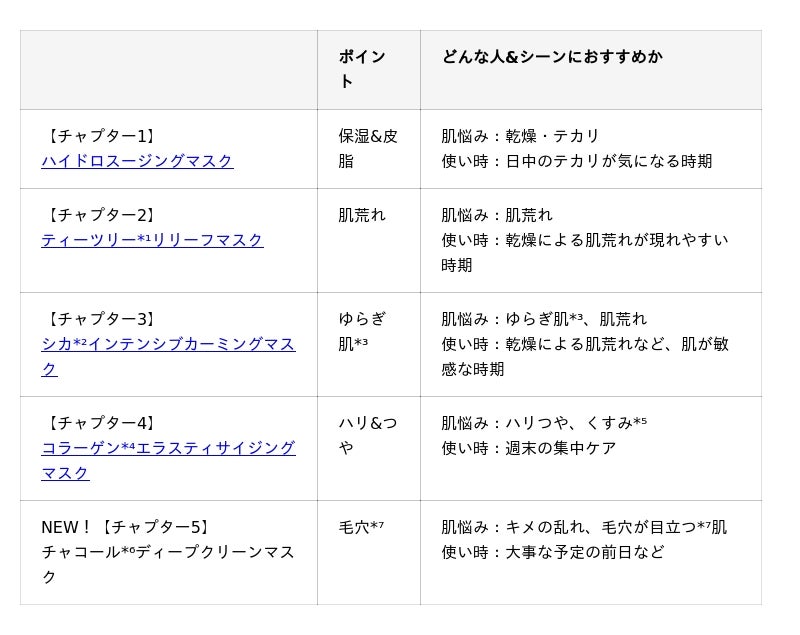プロダクトは5つの「チャプター」で構成され、肌のコンディションや気分に合わせて選べる“物語のようなケア”を提案します。