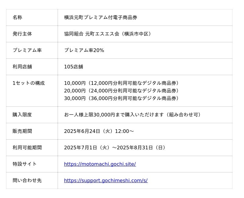 Gigi株式会社(代表取締役:今井了介、所在地:東京都港区)は、協同組合元町エスエス会(所在地:横浜市中区)と連携し、地域経済の活性化を目指し、電子クーポン「第3弾 横浜元町プレミアム付電子商品券」の販売を2025年6月24日(火)12時00分より開始しました。
