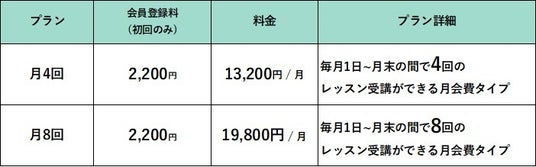 予約専用サイトより、ご希望のレッスン日時をご予約いただく完全予約制です。予約時間の1時間前までお客様ご自身で予約専用サイトからキャンセルが可能で、急な用事などが入ってしまった場合も1回分の費用を消化することなくキャンセル対応が可能で安心です。また、通いたいペースにあわせて、月4回、月8回のプランをお選びいただけます。月の利用回数を超えてご利用されたい場合は1回あたり3,850円をお支払いいただければ追加での受講が可能です。