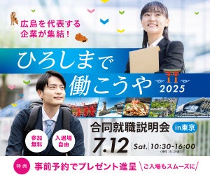 中国新聞社は7月12日10:30~16:00、「ひろしまで働こうや2025 合同就職説明会 in 東京」を東京都千代田区の日本プレスセンターで開く。広島県内に拠点を構える20の企業・団体がブースを設け、会社紹介や人事担当者との交流を企画する。入場無料。