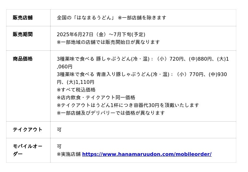 讃岐うどんチェーン「はなまるうどん」を展開する株式会社はなまる(本社:香川県高松市 代表取締役社長:前田良博、以下はなまる)は、2025年6月27日(金)より、全国(※一部店舗除く)のはなまるうどんにて、「3種薬味で食べる 豚しゃぶうどん」「3種薬味で食べる 青唐入り豚しゃぶうどん」を期間限定発売いたします。