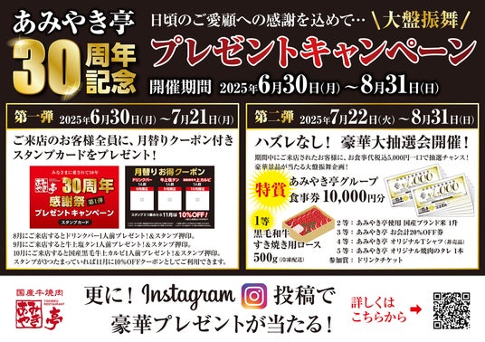株式会社あみやき亭(本社:愛知県春日井市)は、2025年に創業30周年を迎えることを記念し、看板メニュー「カルビ3種」の全面和牛化と「30周年記念 和牛盛り」を中部エリアの全店舗で販売開始いたします。