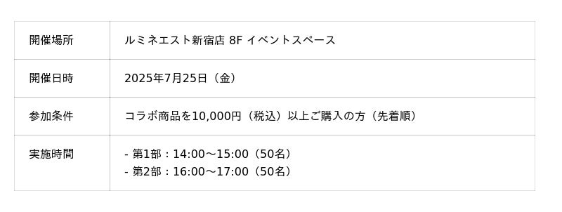さらに、販売開始に合わせ、2025年7月25日(金)にはルミネエスト新宿店にて来店イベントを実施。対象商品をご購入の方の中から先着100名様限定で、みゆ。氏とのチェキ撮影会にご参加いただけます。