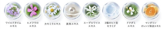 その他、くすみ*⁶をケアするエーデルワイスエキス、真珠エキス*¹¹、カモミールエキス*¹²、ヒメフウロエキスや、うるおいを与える3種のヒト型セラミド*⁸、ドクダミエキスなど、美容保湿成分を贅沢に配合しました。