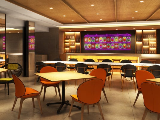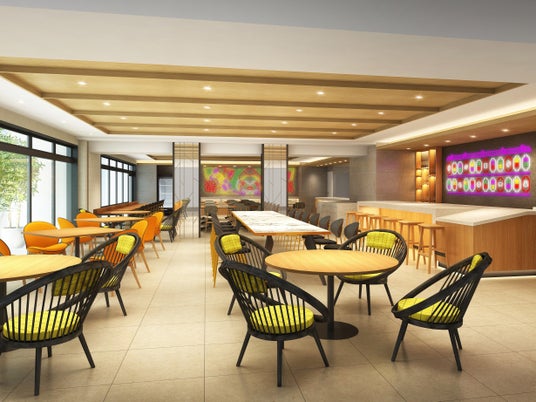 朝食では鉄板で焼きあげる料理や、その場で仕上げるミックスジュースなどが一日の始まりを彩ります。夜になると、はらわた ちゅん子氏が手掛けるネオン輝くパブとして表情を変え、ローカルフードをアレンジした料理などをお楽しみいただけます。