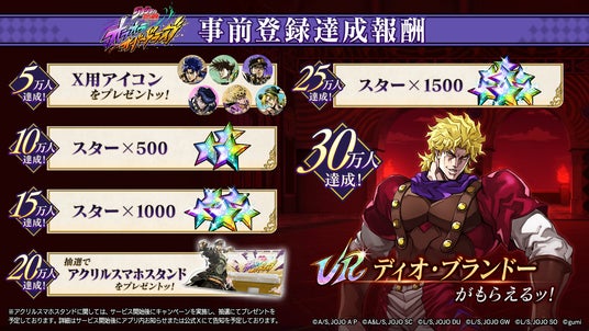 事前登録者数に応じて、ゲーム開始時に豪華報酬をプレゼントいたします。事前登録30万人を達成すると、URユニット「【悪の帝王】ディオ・ブランドー」をプレイヤーの皆さま全員に配布いたします。さらに、30万人達成以降も追加の達成報酬をご用意していますので、ぜひご期待ください。