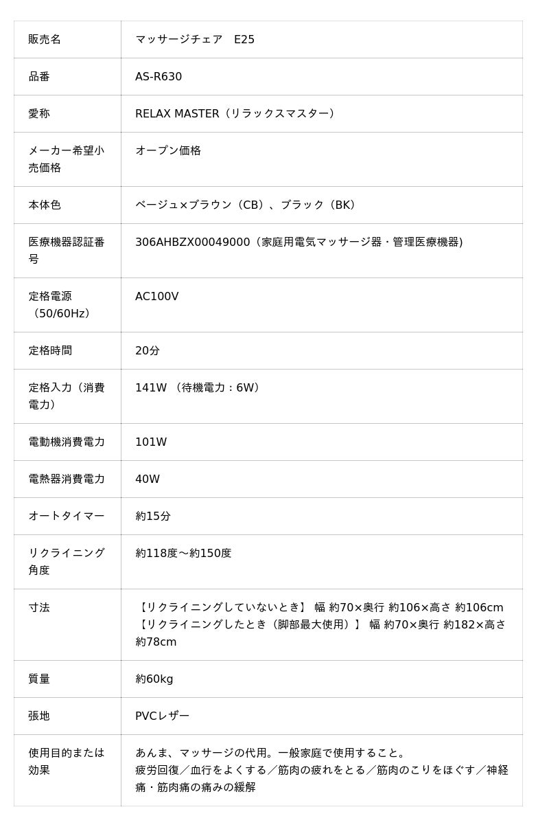 「RELAX MASTER マッサージチェア E25 AS-R630」2025年6月30日 新発売