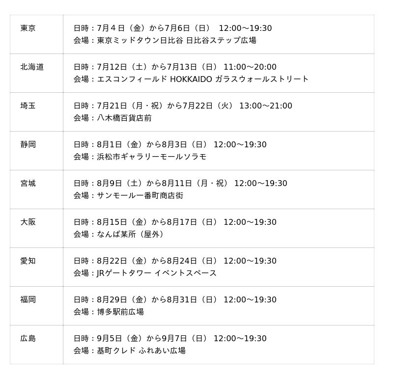 東京・北海道・埼玉・静岡・宮城・大阪・愛知・福岡・広島で7月4日以降、順次展開