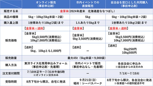 販売価格は、5kg3,500円(消費税込)で、2024年産米の北海道産ななつぼしを金芽米加工して販売します。オンライン販売、市内イベントでの直接販売、自治会を窓口とした共同購入から選ぶことができます。