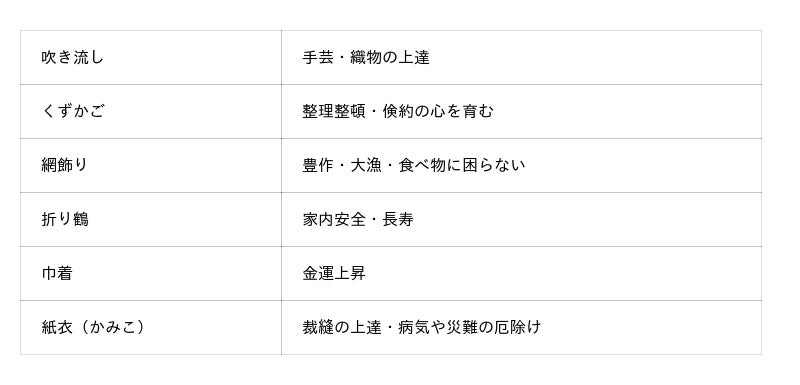 お子さんがいる家庭は、一緒に折り鶴や紙衣などを作って飾るとより楽しめるでしょう。