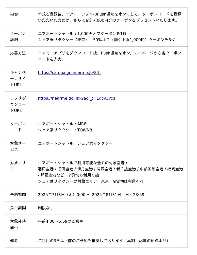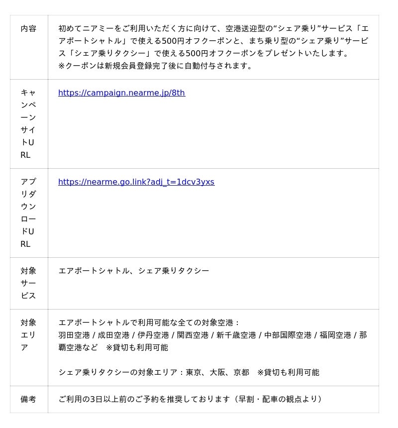 『ニアミー8周年感謝キャンペーン』では、創業8周年を記念し、ユーザーの皆さまへ日頃の感謝を込めてお得な特典をご用意しました。新規会員登録された方にはエアポートシャトルの利用時に使える500円オフクーポン、さらにまち乗り型の“シェア乗り”サービス「シェア乗りタクシー」利用時に使える500円オフクーポンを付与いたします。また、クーポンコードを入力すると、エアポートシャトルとシェア乗りタクシーそれぞれで使える合計7,000円分のクーポンもプレゼント。新規登録特典と合わせると、最大8,000円分のクーポンをご利用いただけます。