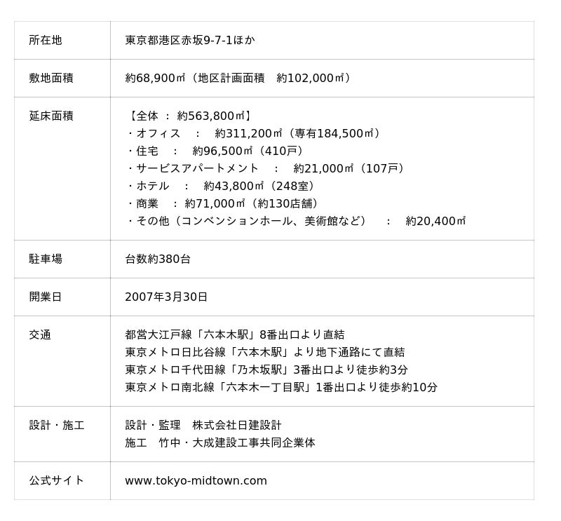 東京ミッドタウンは、かつて防衛庁があった土地にホテル(ザ・リッツ・カールトン東京)、文化施設(サントリー美術館、21_21 DESIGN SIGHTなど)、商業店舗、オフィス、住宅、医療施設、緑地などが集約された大規模複合都市です。