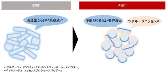 「エッセンスグロウキープパウダー」は資生堂独自の「セラムコーティング製法」を採用し、パウダー1粒1粒を美容液成分でまるごと包みこむことで、メイクしたてのつや・透明感が続く、美容液仕立ての粉感レスなフェイスパウダーです。メイク効果としてつや・透明感を持続させるだけでなく、毛穴補正・カバー効果も搭載しています。また角層のすみずみまでうるおいを届ける浸透型うるおい美容液αも配合しています。