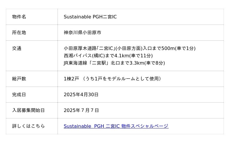 募集詳細および申込み方法は、同日公開したSustainable PGH二宮IC物件スペシャルページにてご案内いたします。ご不明な点等ございましたら、下記お問い合わせ先までご連絡ください。