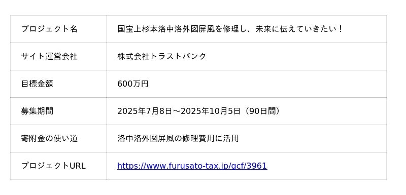 山形県米沢市(市長:近藤洋介)は、2025年7月8日(火)、ふるさと納税総合サイト「ふるさとチョイス」を企画・運営する株式会社トラストバンク(本社:東京都渋谷区、代表取締役:福留大士、以下「トラストバンク」)が提供するクラウドファンディング型でふるさと納税を募る仕組み「ガバメントクラウドファンディング(R)」(以下GCF(R))で、国宝「上杉本洛中洛外図屏風」の保存修理を目的としたプロジェクトを開始します。募集期間は2025年7月8日~10月5日、目標寄付金額は600万円です。
