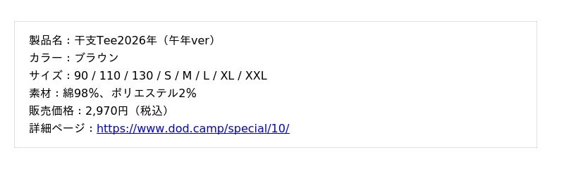 ビーズ株式会社(本社:大阪府東大阪市、代表取締役社長:大上響)が展開するアウトドアブランド「DOD」は、毎年の干支をモチーフとした限定 Tシャツ「干支Tee(エトティー) 」の2026年モデルの受注を2025年7月4日より開始しました。
