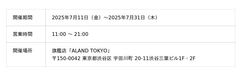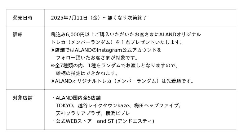また、旗艦店「ALAND TOKYO」(東京・渋谷)では、2025年7月11 日(金)~2025年8月11日(月)までエントランスにてポップアップを開催し、今回のために撮り下ろした巨大ビジュアルや、メンバー着用コーディネートの展示、公式グッズを販売いたします。