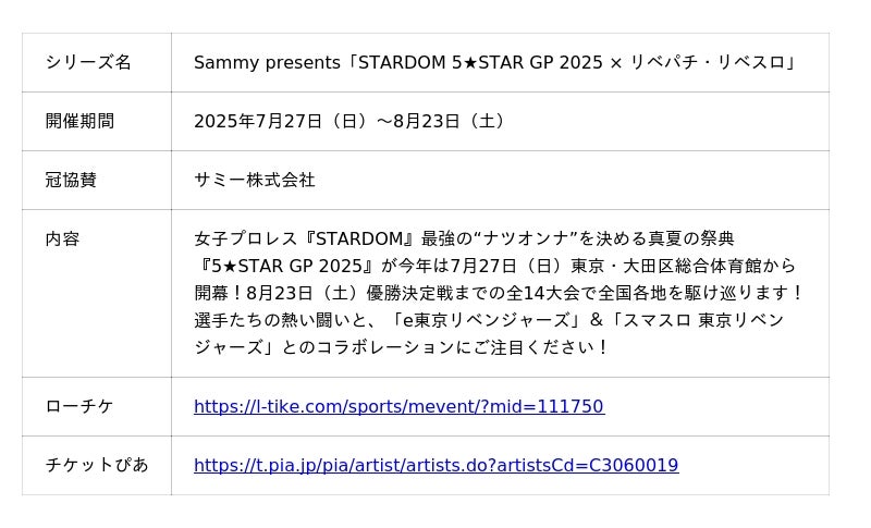 サミー株式会社(本社:東京都品川区 代表取締役 社長執行役員 COO:星野 歩)は、2025年7月27日(日)から開催されるSammy presents「STARDOM 5★STAR GP 2025 × リベパチ・リベスロ」へ協賛することをお知らせいたします。