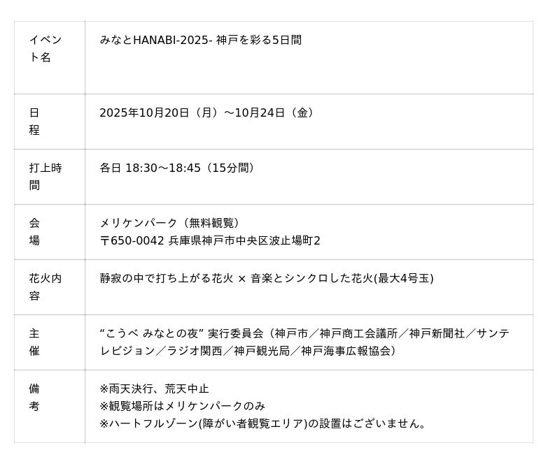 2025年10月20日(月)から24日(金)までの5日間、神戸・メリケンパークにて花火イベント『みなとHANABI-2025-』を開催いたします。