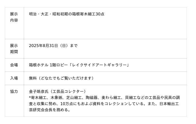 国際興業グループの富士屋ホテル株式会社(本社/神奈川県足柄下郡箱根町宮ノ下359/代表取締役 社長 安藤 昭)では箱根ホテル(神奈川県足柄下郡箱根町箱根65/支配人 久保田 紀和)にて、箱根芸術祭の一環として、箱根の伝統工芸である寄木細工の特別展示を開催中です。本展示では、輸出工芸品コレクターとして国内外で高く評価されている金子皓彦(かねこ・あきひこ)氏のご協力のもと、明治・大正・昭和初期にかけて海外に輸出された寄木細工の中から、厳選した約30点を公開いたします。