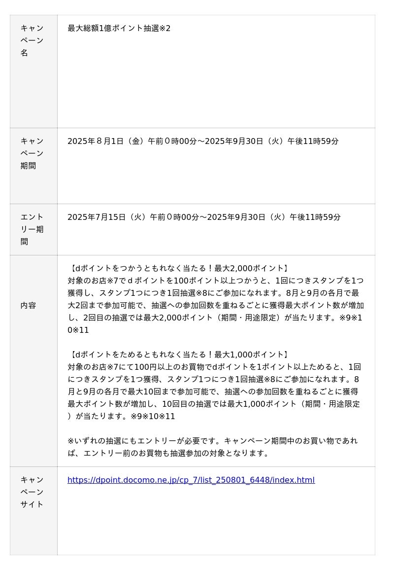 キャンペーンサイト:https://dpoint.docomo.ne.jp/cp_7/alliance_250801_6526/index.html
