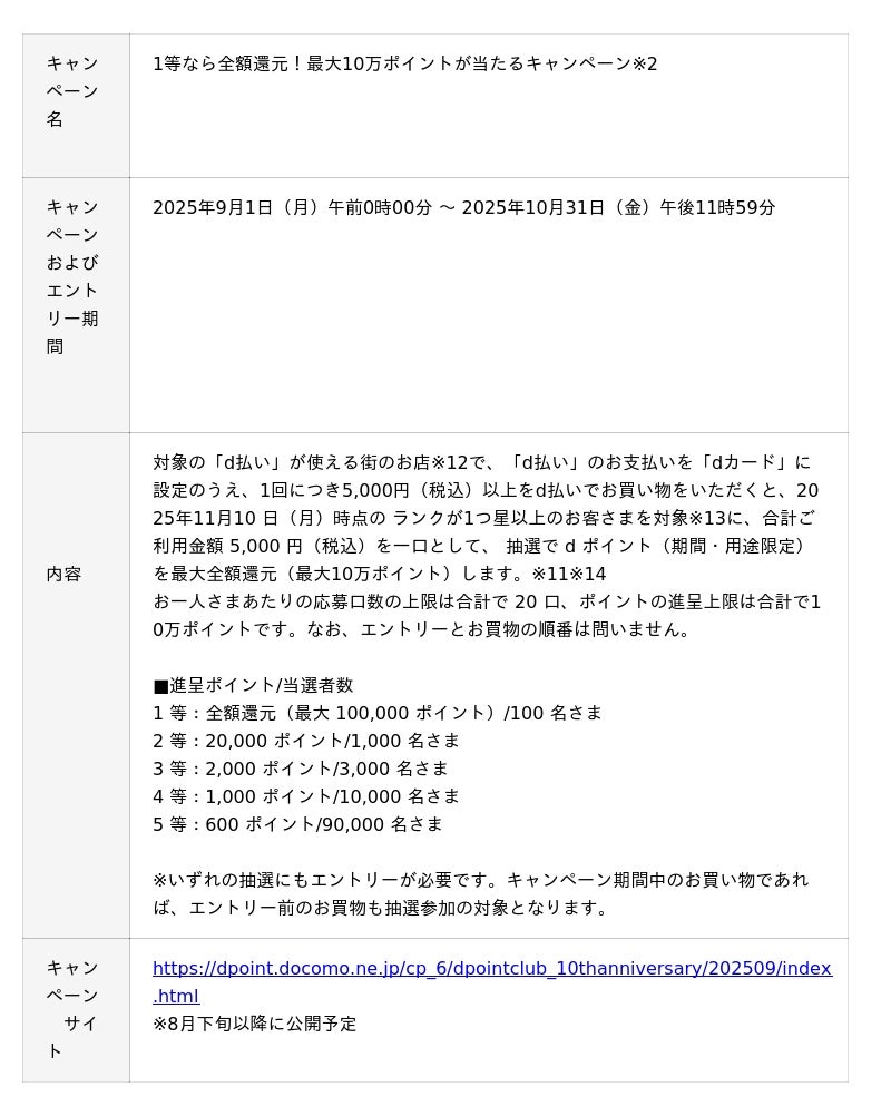 (https://dpoint.docomo.ne.jp/cp_6/dpointclub_10thanniversary/202509/index.html)をご確認ください。