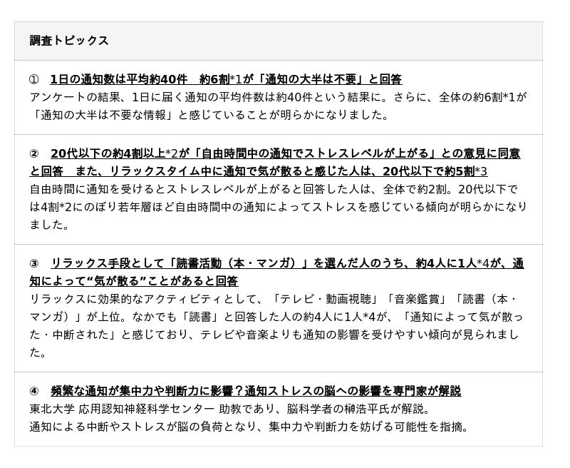 *2: 「自由時間に届くデバイスの通知によってストレスレベルが高くなると感じることがありますか?」という設問に対し、「強く同意する」「やや同意する」と回答した人の合計