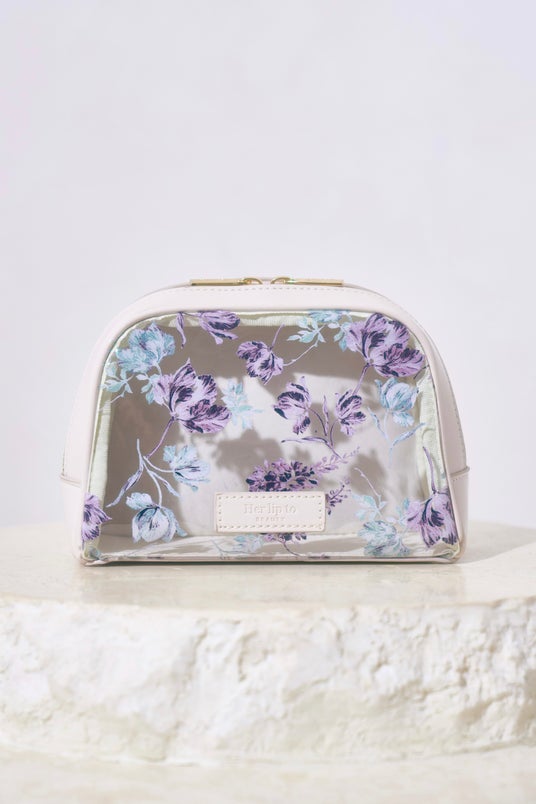 Her lip toのシグネチャーアイテム「Full Of Love Long Dress」の柄が施されたクリアポーチ。お使いいただきやすいようWジップで仕立て、ボディクリームやお気に入りのコスメをたっぷりと収納いただけます。