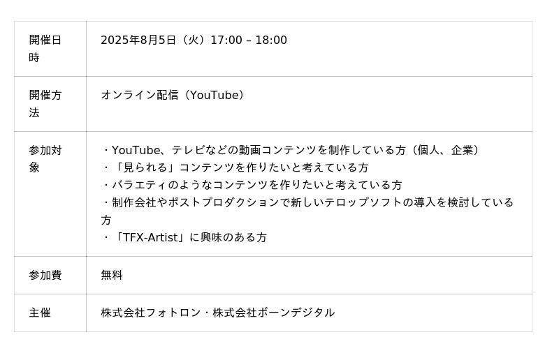 株式会社ボーンデジタル(本社:東京都千代田区、代表取締役:新 和也、URL:https://www.borndigital.co.jp)は、株式会社フォトロンと共同で、オンラインセミナー「バラエティ番組に学ぶ!動画のクオリティを変えるテロップデザイン術」を2025年8月5日(火)に開催いたします。
