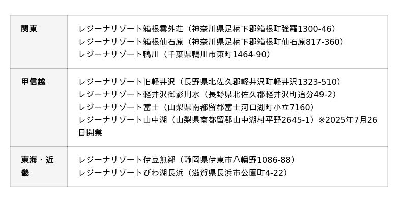 ※1 営業が終了した1施設を除きます。また、本年7月26日開業予定のレジーナリゾート山中湖を含みます。