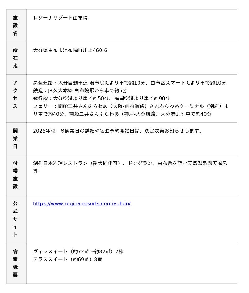 ・ 東京建物リゾートの愛犬同伴型ラグジュアリーリゾートホテル「レジーナリゾート」シリーズ九州初となる「レジーナリゾート由布院」が2025年秋に開業決定。