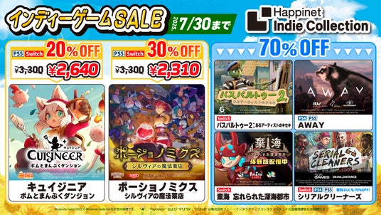 株式会社ハピネット(本社:東京都台東区、代表取締役社長:水谷 敏之、証券コード:7552)は、おもしろいインディーゲームを世界中からセレクトして発売するゲームレーベル「Happinet Indie Collection」タイトルのダウンロード版について、2025年7月30日(水)までセール実施することをお知らせいたします。「キュイジニア ポムとまんぷくダンジョン」は6月のセールに引き続き20%OFF、「ポーショノミクス シルヴィアの魔法薬店」はセール実施以降初となる30%OFFにて販売など、全6タイトルが特別価格でお求めいただけます。
