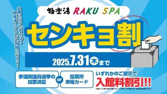 株式会社極楽湯(本社:東京都千代田区、代表取締役社長:佐藤 剛史)は、第27回参議院選挙が行われる2025年7月20日(日)~7月31日(木)の期間中、直営29店舗にて『センキョ割』を実施します。