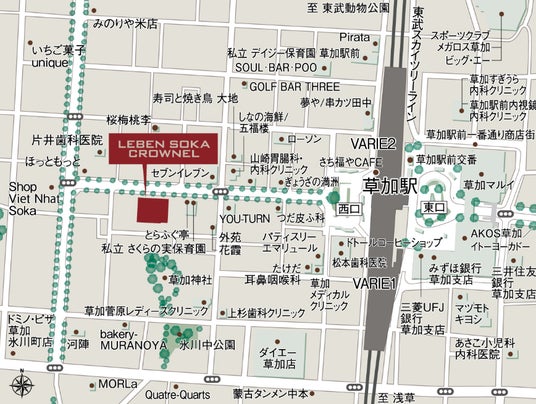 多様な大型商業施設が徒歩6分圏内に充実している点も本物件の魅力の一つです。駅直結の「草加VARIE」(徒歩4分)や「ダイエー草加店」(徒歩5分)をはじめ、「イトーヨーカドー草加店」(徒歩6分)や「草加マルイ」(徒歩6分)が入店する「AKOS」(徒歩6分)など、日々の買い物に便利な商業施設が多数集積しております。加えて、周辺にはコンビニエンスストア、ドラッグストア、豊かな公園、多数の教育施設、そして医療施設も近接しており、日々の生活をより豊かにする住環境が整っています※4。