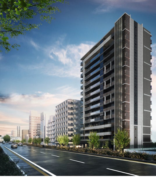 ※1.掲載の環境合成外観完成予想CGは現地周辺を撮影(2024年5月)したものに計画段階の図面を基に描き起こした外観完成予想CGを合成・加工したもので実際とは異なる場合があります。なお、外観の細部・設備機器及び周辺建物等は一部省略又は簡略化しております。植栽は計画段階のもので樹種・設定位置・植高・本数等は変更となる場合があります。竣工時には完成予想CG程度には成長しておりません。