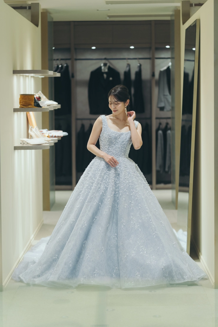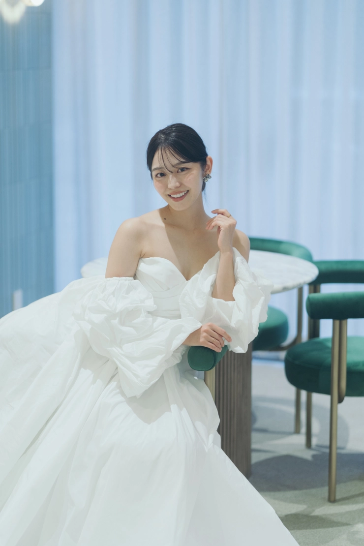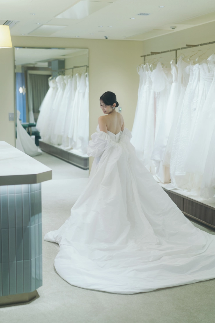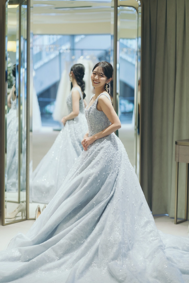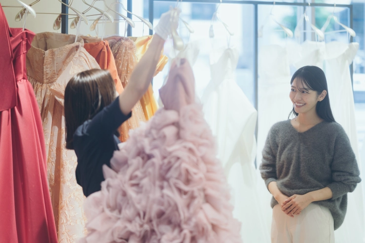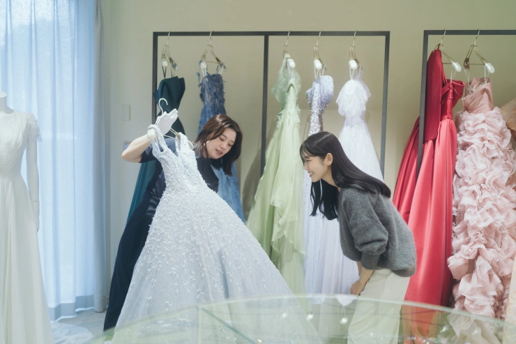 オンラインで選んだドレスは、撮影前日に店舗で最終フィッティング。1〜2時間ほどでサイズ感やシルエットを丁寧にチェックし、当日の着心地や動きやすさをしっかり確認。