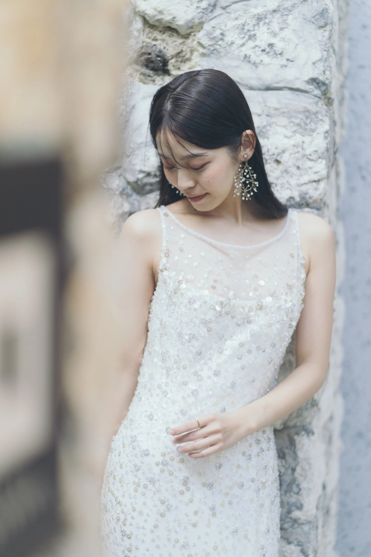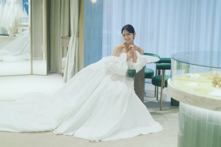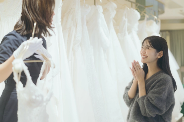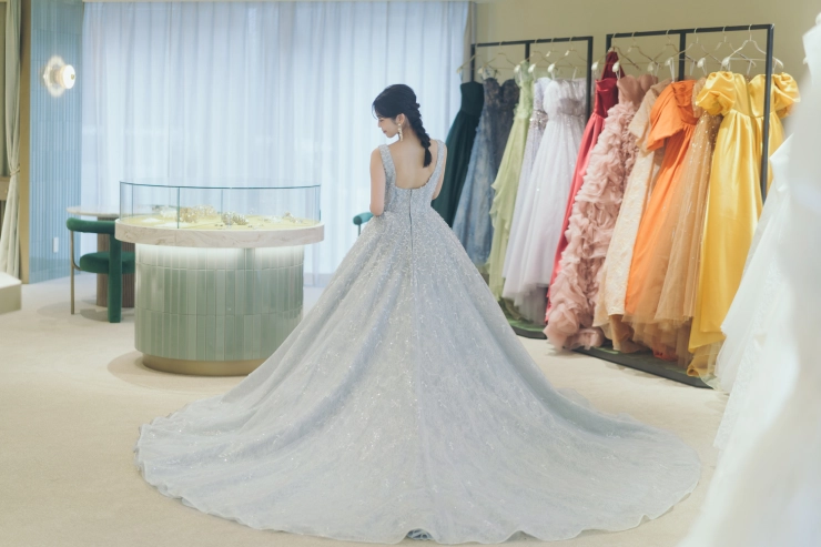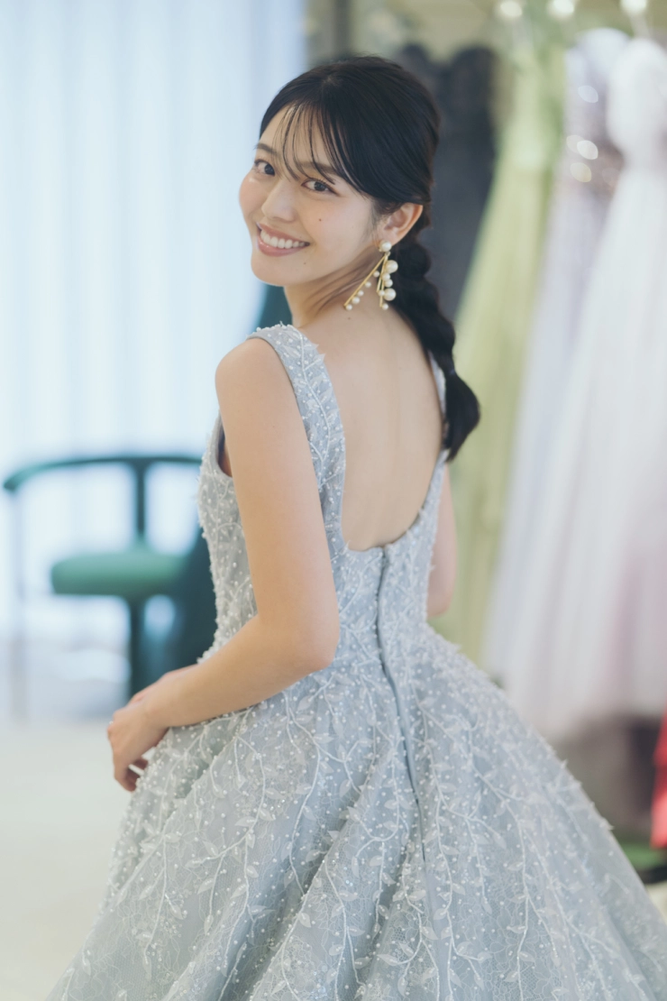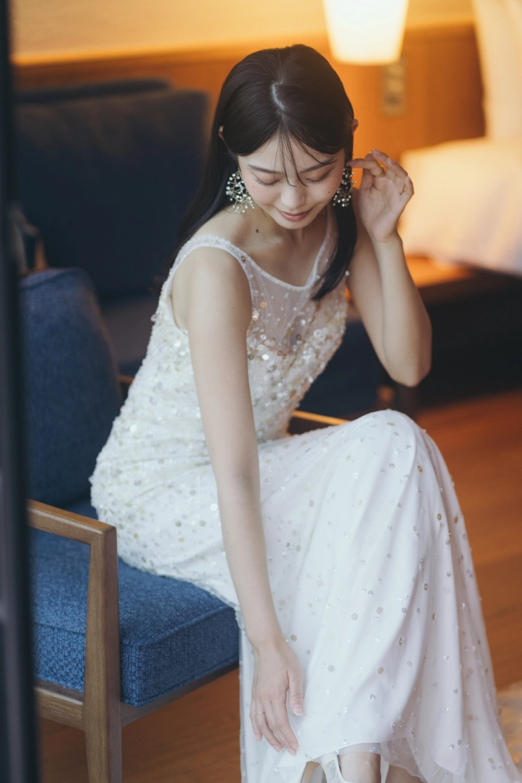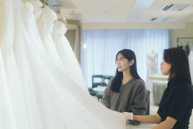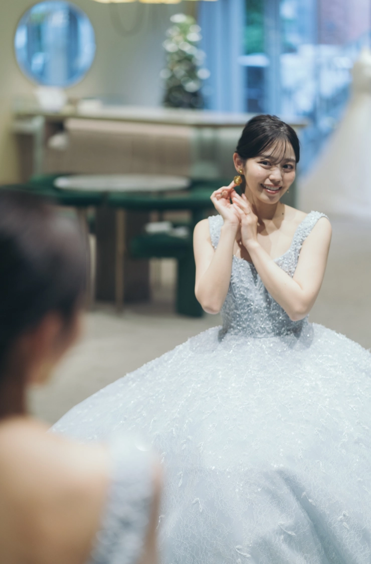 オンラインで選んだドレスは、撮影前日に店舗で最終フィッティング。1〜2時間ほどでサイズ感やシルエットを丁寧にチェックし、当日の着心地や動きやすさをしっかり確認。