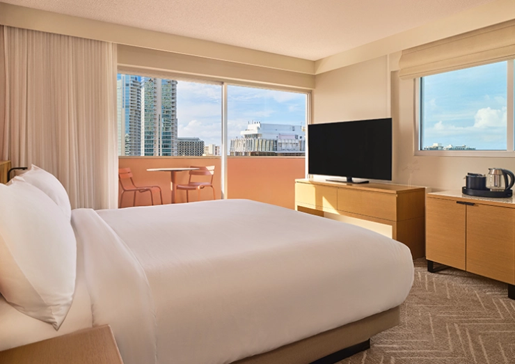 内装は、ホテルの基調カラーであるピンクがお部屋やバルコニーに散りばめられていて、心ときめく華やかさ。お部屋はハワイの海を一望できるオーシャンビューとハワイの街並みを眺めることができるシティービューから選べます。