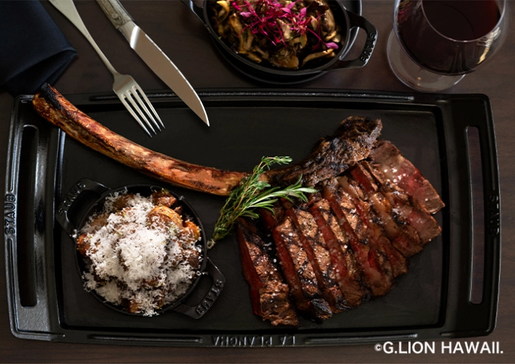 料理は、ハワイ産の新鮮な食材を贅沢に使ったこだわりのラインナップ。さらに、姉妹店の「Hy's Steak House」(ハイズ ステーキ ハウス)から着想を得たテーブルサイドサービスを行っているのが特徴!スタッフが目の前で料理を仕上げてくれるライブ感たっぷりのパフォーマンスを体験できます。